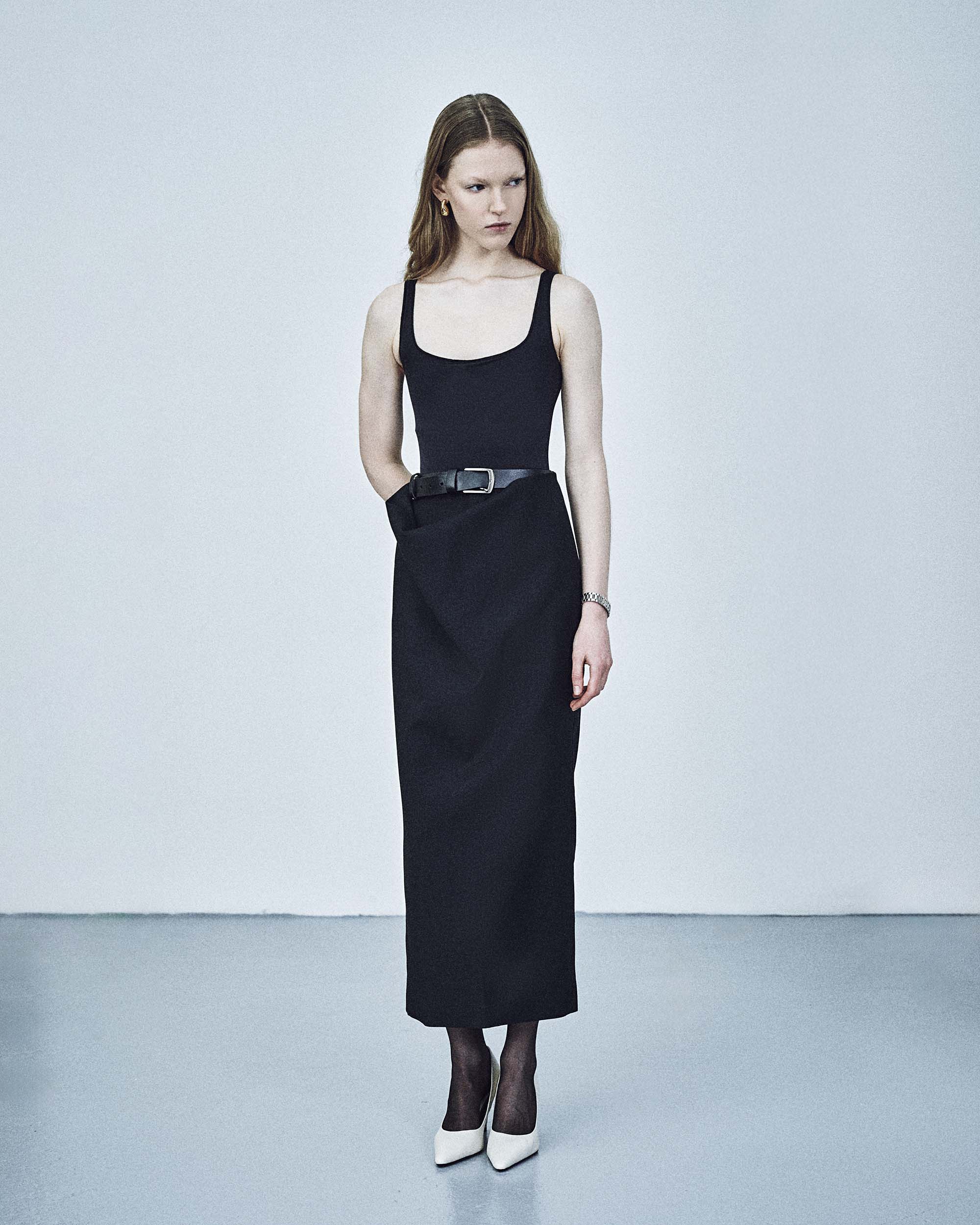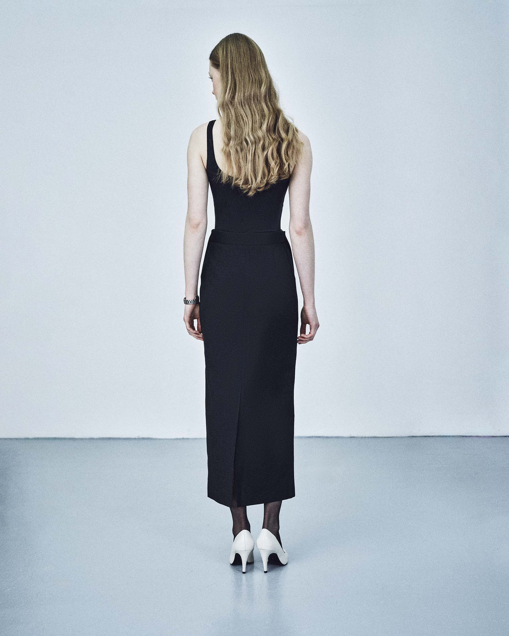 A high-waisted midi skirt featuring an asymmetric drape that creates movement and depth while maintaining a clean silhouette